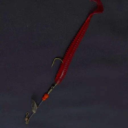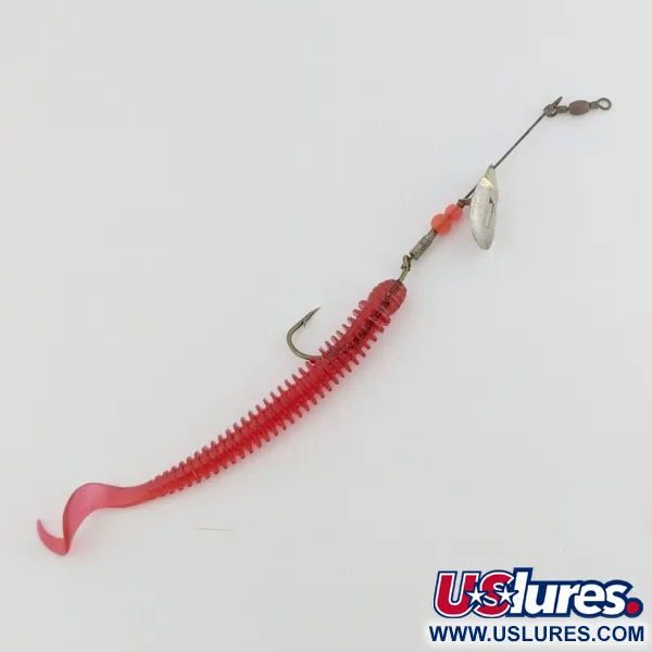 De vernikkelde blad van dit 3/16 oz (6 g) spinner-rig zorgt voor een subtiele schittering tegen het levendige rood van de zachte plastic staart. Met een totale lengte van 10 cm (4") is de Pflueger June Bug №4 voorzien van de kenmerkende offset-arm, ontworpen om het blad vrij van de hoofdas te laten draaien. Twee rode kralen op de staaldraad zorgen voor een kleuraccent en helpen de balans te bewaren. De rig is uitgerust met een enkele haak waarop een geribbelde twister is gemonteerd, wat zorgt voor een groter visueel profiel. Met een conditiescore van 4/5 hebben de metalen onderdelen hun structurele integriteit behouden. Dit item, met productcode 24501, is een klassiek voorbeeld van een rig die een metalen spinner combineert met een zachte trailer.