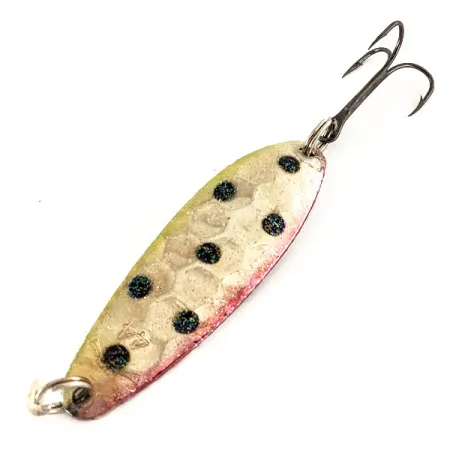 De gehamerde honingraatstructuur zorgt voor een complexe reflectie op het verzilverde oppervlak van deze Pirate Lures lepel, een hoogwaardig kunstaas vervaardigd in de VS. Met een lengte van 6,5 cm (2 1/2") en een gewicht van 12 g (2/5 oz) is het Pirate Joe's Silver Plated model uitgebalanceerd voor veelzijdigheid in het water. De afwerking heeft een lichtgroen-gele tint op de rug en een roze-rode tint op de buik, geaccentueerd door zeven glitterende zwarte stippen die zorgen voor contrastrijke richtpunten tegen de zilveren basis. De achterkant benadrukt de heldere verzilvering en de diepte van het gestempelde schubbenpatroon. Uitgerust met de originele splitringen en een scherpe dreg, verkeert dit model (productcode 12483) in 5/5 conditie. De zilveren afwerking blijft glanzend en toont het vakmanschap dat typerend is voor vintage Pirate Lures ontwerpen voor werpen en trollen.
