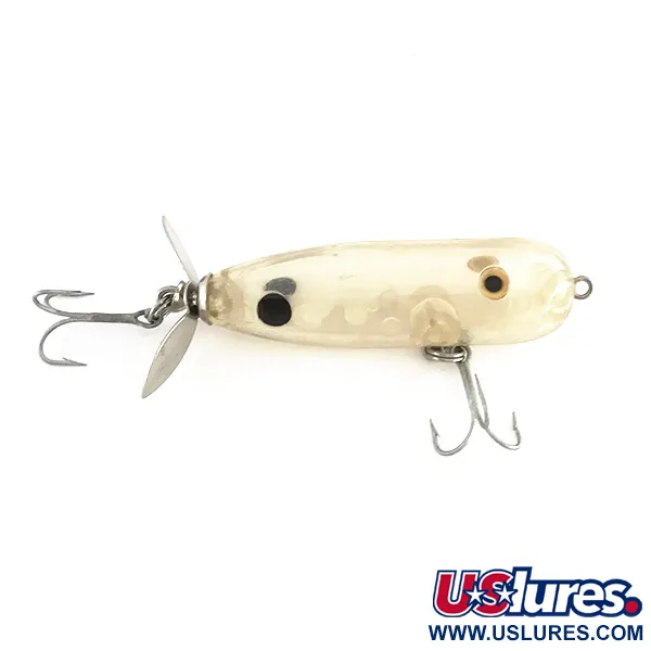 Een enkele zilverkleurige propeller bevindt zich aan de achterzijde van deze klassieke topwater walker, ontworpen om het wateroppervlak te beroeren tijdens een gelijkmatige binnenhaal. Met een gewicht van 9,5 g (1/3 oz) en een lengte van 6,5 cm (2 1/2"), is dit model voorzien van een volledig transparante kunststof body die de interne ratelkogels onthult die verantwoordelijk zijn voor het luidruchtige profiel. Geïdentificeerd door productcode 7917, is het kunstaas een kenmerkende creatie van het Amerikaanse bedrijf The Producers. De visuele aantrekkingskracht wordt versterkt door grote, contrastrijke geschilderde ogen, die een duidelijk doelwit vormen voor aan de oppervlakte jagende roofvissen zoals baars en snoek. De hardware bestaat uit twee dreggen — één aan de buik en één achter de propeller — bevestigd aan een afgerond, sigaarvormig frame. Dit goed onderhouden exemplaar vertoont geen gebruikssporen en heeft een conditiescore van 5/5.