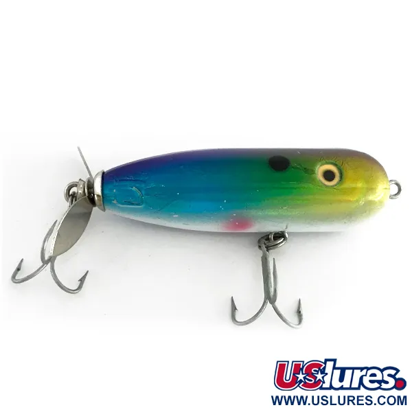 Levendige regenboogtinten kenmerken de afwerking van dit 6,5 cm (2 1/2") oppervlaktekunstaas, waarbij goudgeel bij de neus overgaat in weelderig groen, blauw en een diep violette bovenkant. Dit exemplaar van het merk Producers, herkenbaar aan productcode 8297, is een klassiek Amerikaans topwater-gereedschap ontworpen om oppervlakte-turbulentie te genereren. Een roestvrijstalen propeller aan de achterzijde zorgt voor opspattend water, terwijl een interne ratelkamer een ritmisch geluid produceert tijdens het binnenvissen. Het slanke, langgerekte lichaam is voorzien van twee scherpe dreggen die zijn bevestigd met schroefogen. Een duidelijke zwarte stip bevindt zich achter de kop, met een klein roze aanvalspunt op de witte buik. De geschilderde gele ogen met donkere pupillen geven de taps toelopende neus een traditionele uitstraling. Met een conditiescore van 5/5 is het exemplaar opmerkelijk schoon, met heldere lak en glanzende metalen onderdelen. Met een gewicht van 9,5 g (1/3 oz) biedt het de nodige massa voor nauwkeurige worpen gericht op rovers in de kantzone.