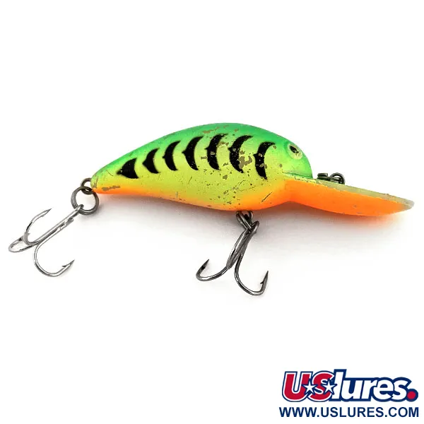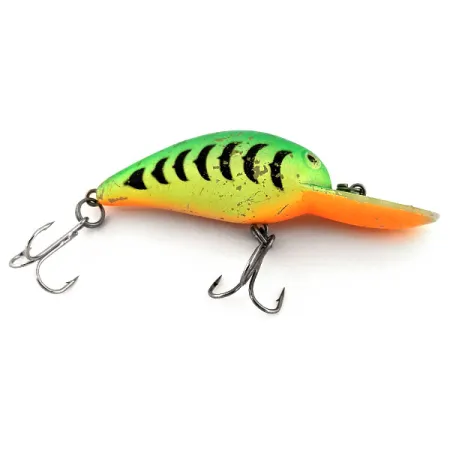 Deze vintage Amerikaanse plug, uitgevoerd in het opvallende Fire Tiger-kleurenpatroon, is ontworpen voor zowel werpend vissen als trollen. Met een gewicht van 1/3 oz (10 g) en een lengte van 2 1/4" (5,5 cm) richt de Producers B52 UV zich op snoekbaars en snoek binnen een dieptebereik van 1,8–2,4 m (6–8 ft). Dit drijvende model met ratel heeft productcode 13175 en valt op door zijn UV-reactieve eigenschappen. Bij blootstelling aan ultraviolet licht licht de afwerking fel op, een functie die speciaal is ontworpen voor betere zichtbaarheid in diep of troebel water. De montage bestaat uit twee scherpe dreggen en de body vertoont lichte, authentieke gebruikssporen passend bij een 4/5 conditie. De feloranje keel en de duiklip vormen een scherp contrast met de groen-zwart gestreepte rug.