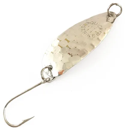 Een gehamerde zilveren textuur kenmerkt het visuele profiel van deze 5,2 cm (2") trollinglepel, ontworpen om licht effectief te reflecteren tijdens een gelijkmatige inhaalbeweging. Duidelijk gestempeld met de Quickstrike merknaam op de voorzijde, blijft dit in de USA gemaakte exemplaar, gecatalogiseerd onder code 4706, in uitstekende staat met een score van 5/5. Met een gewicht van 2,5 g (3/32 oz) is het kunstaas voorzien van een robuuste enkele haak die verbonden is via een zilverkleurige splitring. De langwerpige druppelvorm is specifiek afgestemd op het trollend vissen. De metallic afwerking behoudt zijn oorspronkelijke glans over het gehamerde oppervlak, en een tweede splitring bevindt zich aan de kop voor een veilige lijnbevestiging.
