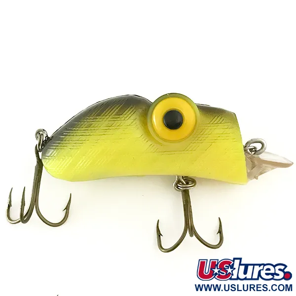 Geel en zwarte kruisarcering over de rug identificeert deze Rabble Rouser Rouster onmiddellijk als een opvallend icoon uit de Amerikaanse hengelsportgeschiedenis. Met een lengte van 5,5 cm (2 1/4") en een gewicht van 13 g (1/2 oz), is dit model 6658 ontworpen voor zowel werpen als trollen. De extra grote gele ogen met gecentreerde zwarte pupillen geven het kunstaas de karakteristieke "bug-eyed" look die verzamelaars van dit merk herkennen. Als een luidruchtig, drijvend exemplaar kan het tijdens het binnenvissen dieptes van 3,5 m (11,5 ft) bereiken. De heldere, getrapte duiklip en de dubbele dreg zien er uitstekend uit, wat de conditiescore 5/5 weerspiegelt. Omdat alle kunstaas van deze fabrikant exclusief in de VS werd geproduceerd, behoudt de afwerking een robuuste kwaliteit die geschikt is voor het vissen op snoek of snoekbaars.