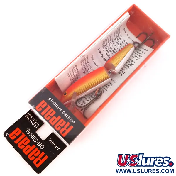 Goud-oranje tinten van de GFR (Gold Fluorescent Red) afwerking domineren het profiel van deze 7 cm (2 3/4") balsa plug. Deze Rapala Jointed J-7 is handmatig afgesteld en getest in een watertank in Finland, weegt 4 g (1/8 oz) en is ontworpen voor dieptes tussen 1,2 m en 1,8 m. Dit specifieke exemplaar is ongebruikt, bewaard in de originele oranje doos met de fabrieksinstructies. Het gedeelde lichaam is ontworpen voor werpen of trollen, waarbij het een stabiele actie behoudt, zelfs tijdens een langzame "stop and go" binnenvistactiek. Fins vakmanschap is duidelijk zichtbaar in de nauwkeurige montage van de scharnierende segmenten, een kenmerk bedoeld om aanbeten van forel, baars en snoek uit te lokken. Het label bevestigt het model als een J-7 GFR, een vaste waarde voor sportvissers die het drijvermogen en de respons van echt balsahout waarderen.