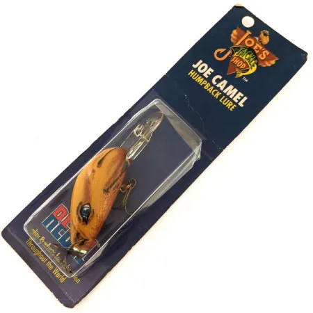 Afgewerkt in een kenmerkende camelkleur, toont dit promotieartikel de iconische mascotte Joe Camel direct op het profiel van 5 cm (2"). Geproduceerd door Rebel voor Joe's Tackle Shop, weegt de Humpback Humpy (productcode 12894) 10 g (1/3 oz) en vertegenwoordigt een unieke cross-over tussen tabaksverzamelobjecten en vintage visuitrusting. Dit exemplaar is ongebruikt in de originele blisterverpakking en heeft een conditiescore van 6. Het kunstaas is gebouwd met een interne ratelkamer en een grote heldere duiklip die is ontworpen om diepere waterkolommen te bereiken. Op de achterkant van de kaart benadrukt de tekst de samenwerking tussen de fabrikant en het sigarettenmerk, waarbij specifiek de oorsprong bij Rebel wordt vermeld. De hardware bestaat uit twee scherpe, bronskleurige dreggen die zijn bevestigd met roestvrijstalen splitringen.