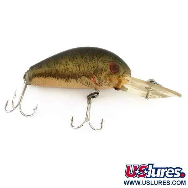 Met een gewicht van 1/3 oz (10 g) is het compacte 2" (5 cm) lichaam van deze Rebel Deep Humpy ontworpen om dieptes te bereiken waar standaard crankbaits simpelweg niet kunnen komen. De Shrimp-kleurstelling is bij dit exemplaar bijzonder goed uitgevoerd, met een donker, geschubd olijfgoud patroon langs de rug dat overgaat in een gladde, crèmekleurige buik. Een extra grote, heldere duiklip is het bepalende structurele kenmerk van dit 7911-model, gecombineerd met een intern ratelsysteem voor een hoorbare aanwezigheid in de waterkolom. Dit specifieke kunstaas is vervaardigd in de USA en verkeert in een 5/5 conditie, waarbij de verf rond de roodomrande ogen en kieuwdeksels strak blijft. Het is een drijvend type kunstaas, uitgerust met twee originele zilverkleurige dreggen die geen sporen van slijtage vertonen.