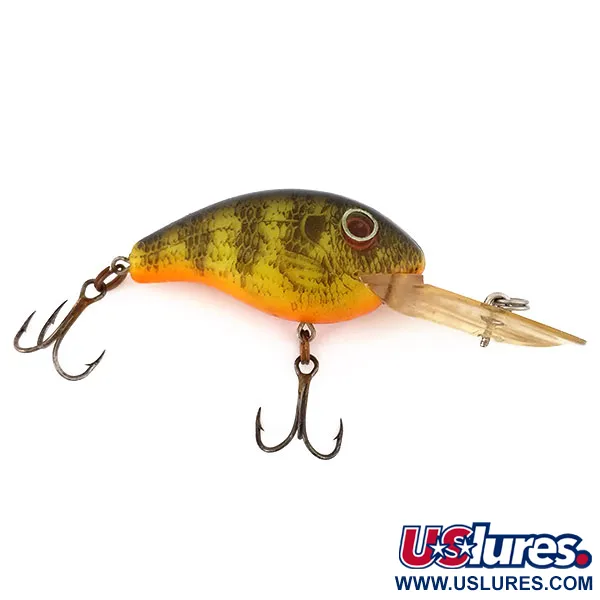 Met een gewicht van 10,5 g (3/8 oz) is het compacte 5 cm (2") lichaam van deze Rebel Deep Wee R ontworpen om dieptes van 2,4–3,0 m (8–10 ft) te bereiken. Het Baars-kleurschema heeft een donkere rug met textuur die overgaat in een feloranje buik, wat zorgt voor een hoog visueel contrast in de waterkolom. Geïdentificeerd door productcode 10865, is deze drijvende crankbait uitgerust met zijn originele extra grote transparante duiklip, een kenmerk van de Deep-variant die wordt gebruikt voor zowel werpen als trollen. Dit exemplaar vertoont enkele lichte krassen op de zijkanten en het originele beslag vertoont wat verdonkering, wat resulteert in een conditie van 3,5/5. De dreggen zijn nog stevig bevestigd via de originele splitringen, klaar voor de tacklebox of verzameling.