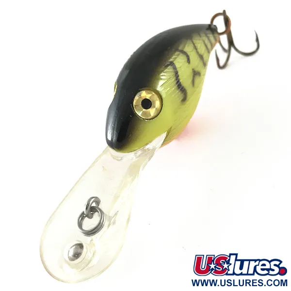Verticale donkere strepen over een geelgroen lichaam kenmerken de Perch-afwerking van deze dieplopende specialist. Met een gewicht van 10,5 g (3/8 oz) en een lengte van 5 cm (2"), draagt dit exemplaar productcode 6706 en verkeert het in 5/5 conditie. De extra grote heldere duiklip is ontworpen om dieptes van 2,4 tot 3,0 m (8 tot 10 ft) te bereiken, waardoor diepgelegen structuren effectief kunnen worden bevist. Een opvallende oranje buik zorgt voor een hoog visueel contrast, terwijl het bevestigingsoog direct op de duiklip is gemonteerd voor stabiliteit tijdens het binnenvissen. Dit in de USA vervaardigde kunstaas is voorzien van gegoten ogen en scherpe dreggen, wat de klassieke constructie van de Deep Wee R-serie weerspiegelt.