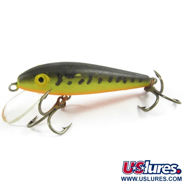 Fire Tiger-patronen zoals op dit exemplaar van 1 1/2" (4 cm) zijn al lang een begrip bij Rebel, met een levendige oranje buik die overgaat in een limoengele flank met opvallende zwarte verticale strepen. Deze in de VS gemaakte plastic plug heeft productcode 3267 en weegt slechts 1/16 oz (2 g). Hij is gebouwd voor ondiep water en bereikt een diepte van 3 ft (0,9 m) tijdens het werpen of trollen. De conditie is 5/5, waarbij de lak en de originele dreg in uitstekende staat verkeren. Voor de presentatie gebruiken vissers meestal een gestage inhaalslag of een stop-and-go-techniek. De heldere plastic duiklip is schoon en stevig bevestigd, en de gele ogen met zwarte pupillen geven de kop een kenmerkende uitstraling.