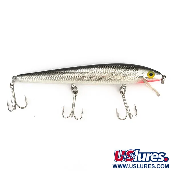 Met een lengte van 12 cm wordt het uiterlijk van deze in de VS gemaakte Rebel Floater bepaald door een klassiek zilveren schubbenpatroon. Dit kunstaas, met productcode 8406, heeft een traditionele zilveren afwerking gecombineerd met een donkere rug en een kenmerkend rood accent op de kin. Met een gewicht van 10 g is de kunststof constructie ontworpen voor diverse technieken, zoals binnendraaien of stop-and-go bij het werpen of trollen. De heldere duiklip is gemaakt om dieptes tussen 0,9 m en 2,1 m te bereiken. Er zijn drie scherpe dreggen gemonteerd en de opvallende gele ogen met zwarte pupillen zorgen voor een focuspunt. Dit exemplaar verkeert in 5/5 conditie, waarbij de zilveren afwerking en het beslag uitstekend bewaard zijn gebleven.