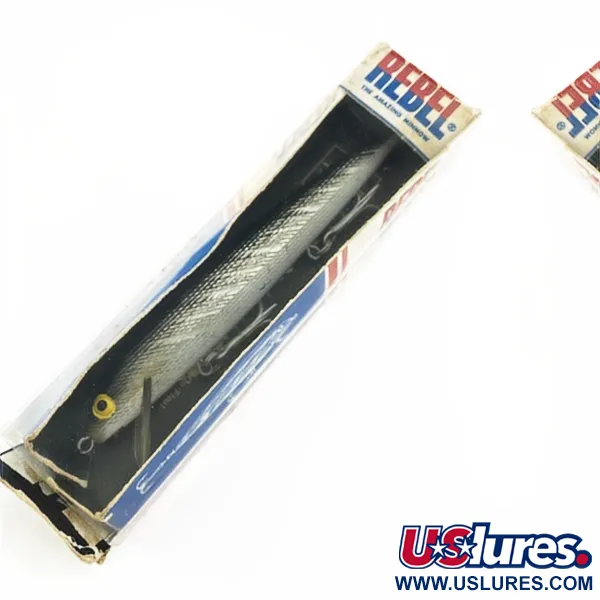 Zilveren schubpatroon afwerkingen zoals op deze F12 Floater typeren het plastic tijdperk van de Amerikaanse hengelsport uit het midden van de vorige eeuw. Met een gewicht van 9 g (1/3 oz) en een lengte van 12 cm (4 3/4") is dit exemplaar ongebruikt gebleven en bewaard in de originele vensterdoos. Rebel kunstaas, afkomstig uit de USA, was pionier in het gebruik van hoogwaardige kunststoffen om een consistent drijfvermogen en duurzaamheid te bereiken. Dit specifieke model, aangeduid met productcode 23929, is ontworpen om een werkdiepte van 1,2–1,8 m (4–6 ft) te bereiken bij zowel werpend vissen als trollen. Het reflecterende zilveren lichaam is voorzien van drie stevige dreggen, wat de robuuste hardware illustreert die Rebel koos voor hun grotere minnow-profielen. De doos zelf is voorzien van vroege branding, een knipoog naar de historische verpakkingsstijl van het bedrijf. Grote ogen met een gele rand vormen een focuspunt tegen het gestructureerde zijpatroon. De transparante kunststof duiklip is stevig in de neus geïntegreerd, waardoor het kunstaas tijdens het constant binnenhalen of een stop-and-go presentatie binnen het beoogde bereik van 1,2 – 1,8 m blijft.