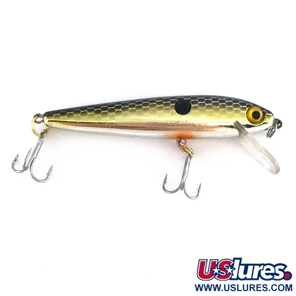 Uitgevoerd in een klassieke overgang van goud naar zilver met een kenmerkend honingraatpatroon op de rug, weerspiegelt deze in Amerika gemaakte kunststof minnow het betrouwbare ontwerp waar Rebel om bekend staat. Met een gewicht van 1/8 oz (4 g) en een lengte van 2 3/4" (7 cm), draagt dit exemplaar de productcode 8013. De grote zwarte schoudervlek en de opvallende gele ogen contrasteren met het metalen lichaam, een visueel kenmerk dat vaak wordt aangetroffen op vintage modellen die aasvis imiteren. Als drijvend F7-model is hij ontworpen om dieptes tussen 0,9-1,8 m (3-6 ft) te bereiken bij het werpen of licht trollen. De heldere, geïntegreerde duiklip en de originele zilveren dregjes verkeren in uitstekende staat, wat dit kunstaas een conditiescore van 5/5 oplevert. De constructie is solide, bedoeld voor gestaag binnenvissen of technische stop-and-go-benaderingen in zoetwater.