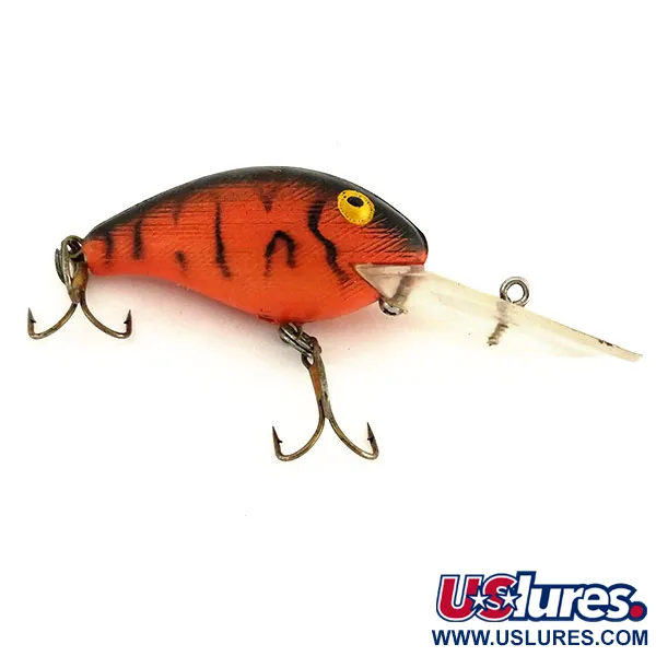 Het Brown Tiger-patroon zoals deze was een klassieker voor Rebel, met een felle oranje basis, contrasterende zwarte verticale strepen en een donkere rug. Met productcode 9583 meet dit drijvende model 5 cm (2") en weegt het 11 g (2/5 oz). De hardware is in topstaat, voorzien van twee scherpe dreggen en stevige splitringen, wat bijdraagt aan een conditiescore van 5/5. De constructie bevat een grote, heldere duiklip om dieptes van 2,4 - 3,0 m te bereiken, waardoor de plug geschikt is voor zowel werpen als trollen. De iconische Amerikaanse makelij wordt verder benadrukt door het kenmerkende profiel met de hoge rug en klassieke geschilderde gele ogen met grote zwarte pupillen.