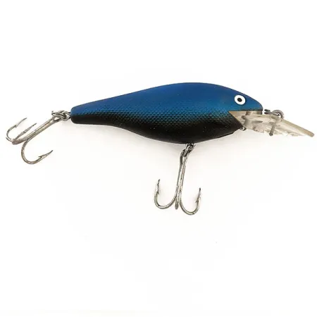Een diepe, matblauwe afwerking bedekt het bovenste gedeelte van het getextureerde lichaam van deze plug, overgaand in een effen zwarte buik. Gecatalogiseerd onder productcode 11576, meet deze Rebel Shallow Fastrac 7 cm (2 3/4") en weegt 9 g (1/3 oz). Het is een drijvend model, ideaal voor werpen of trollen, specifiek wanneer u in de diepte van 0,6 tot 1,8 m (2 - 6 ft) moet blijven. De heldere, afgeronde duiklip is stevig bevestigd en het exemplaar vertoont zeer weinig slijtage, met een conditiescore van 5/5. Opvallende details zijn de klassieke wit-en-zwart geschilderde ogen en het fijne schubbenpatroon dat in het plastic is gegoten, kenmerkend voor deze in de VS gemaakte Rebel-pluggen. De originele dregjes zijn scherp en bevestigd met stevige splitringen. Dit specifieke blauw-op-zwart schema werd vaak gekozen vanwege het silhouet tegen het oppervlak bij weinig licht of wanneer het water enigszins troebel was.