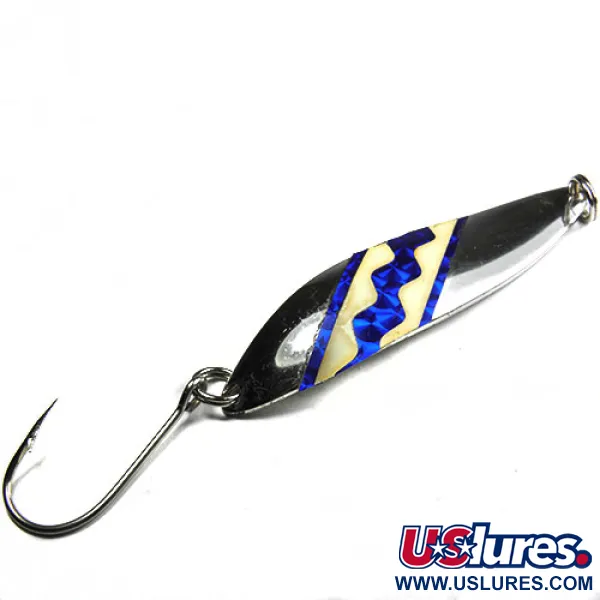 Duidelijk in de gepolijste nikkelen achterzijde gestanst, bevestigt het "RED EYE LURES" merk de afkomst van deze in Amerika gemaakte lepel. Met een gewicht van 1/2 oz (14 g) en een lengte van 3" (7,5 cm), is het metalen lichaam voorzien van een hoogwaardige blauw met crème zigzag-sticker die voor een scherp contrast zorgt tegen de reflecterende nikkelen afwerking. Dit specifieke exemplaar, geïdentificeerd door productcode 0287, is uitgerust met een zware enkele haak bevestigd via een stevige splitring, wat het een betrouwbare keuze maakt voor het werpen bij obstakels of trollen in diep water. De productiekwaliteit van Eppinger is duidelijk zichtbaar in de dikte van het metaal, wat een aanzienlijk gewicht geeft voor zijn formaat. De conditie van dit kunstaas is een solide 4/5, met zeer goed bewaarde oppervlakken en intacte stickers.