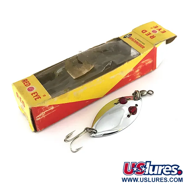 Twee felrode gefacetteerde kralen, de kenmerkende "ogen" van dit model, zijn stevig verankerd in het gepolijste nikkelen lichaam van deze Amerikaanse klassieker. Deze Hofschneider-creatie, gecatalogiseerd onder productcode 7583, weegt 6,5 g (1/4 oz) en meet 4,5 cm (1 3/4"). Het kunstaas is ongebruikt en zit nog in de originele geel-rode doos. De hoogglanzende nikkelen afwerking is bedoeld voor maximale zichtbaarheid, wat vooral nuttig is bij het langzaam binnenvissen op snoek of baars in warmer water. Jarenlange opslag heeft wat sporen van slijtage achtergelaten op de kartonnen en plastic verpakking, maar de lepel zelf behoudt zijn originele fabrieksglans. Hij is uitgerust met een scherpe dreg en een ingebouwde wartel aan de neus, een standaardconfiguratie voor dit type lepel dat is ontworpen om kinken in de lijn tijdens het werpen of trollen te minimaliseren. De stempeling op het metalen lichaam bevestigt de herkomst van de Hofschneider Corp. uit Rochester, New York.