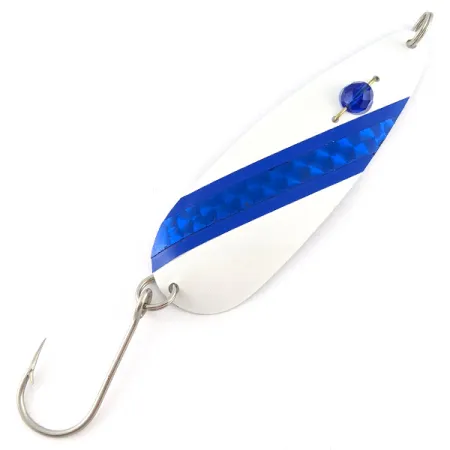 Een opvallende blauwe honingraat-foliestrip accentueert de strakke witte afwerking van deze Red Eye Evil Eye lepel. Met een lengte van 9 cm en een gewicht van 9 g is het profiel ontworpen voor optimale zichtbaarheid tijdens het trollen of werpen. Het kenmerkende gefacetteerde blauwe kraaloog, een klassiek detail van de in de VS geproduceerde Red Eye Lures, is door het gestanste metalen lichaam heen bevestigd. Beoordeeld met een 5/5 behoudt dit exemplaar een levendige uitstraling van zowel het lakwerk als de onderdelen, inclusief een enkele haak die met een splitring is bevestigd. Productcode 23367 illustreert hoe de fabrikant verschillende texturen gebruikt om licht vanuit diverse hoeken te reflecteren.