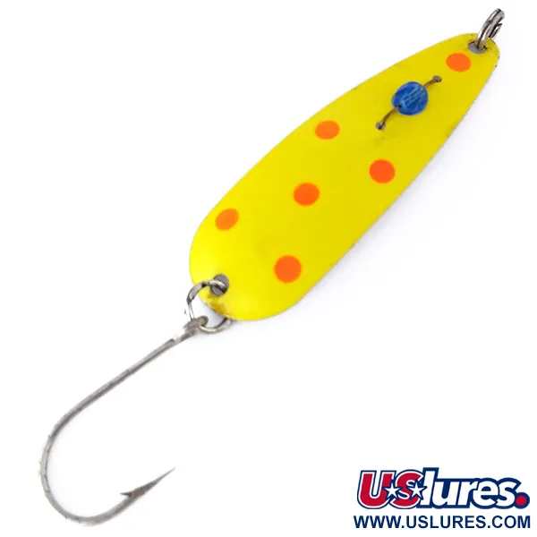 Gele lak en levendige rode stippen bedekken het 7,5 cm (3") lange lichaam van deze Eppinger Red Eye Evil Eye UV lepel. De kunstaas, geregistreerd onder productcode 10496, is voorzien van het iconische blauwe glazen kraaloog dat in het midden is bevestigd. Hoewel hij bij daglicht heldergeel lijkt, is de afwerking zo samengesteld dat deze een lichtgevende groene gloed afgeeft bij blootstelling aan UV-licht, een technisch detail bedoeld om de zichtbaarheid in diepere waterlagen te vergroten. De hardware bestaat uit een enkele haak met een grote opening en een stevige splitring, speciaal ontworpen voor het trollen. Dit exemplaar verkeert in 5/5 conditie, met een gladde afwerking en een heldere glaskraal. Een gewicht van 6g (3/16oz) zorgt voor een solide gevoel bij het compacte profiel van de lepel.