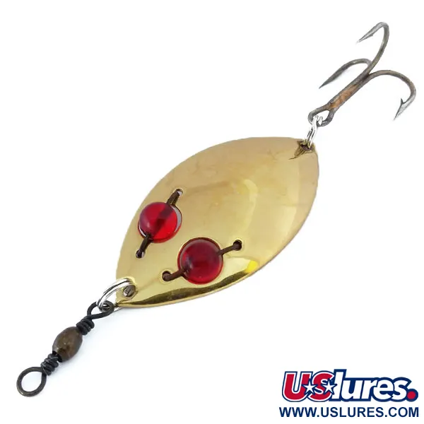 Schitterend in een klassieke gouden afwerking, toont het gestanste lichaam van deze lepel trots zijn erfgoed uit Rochester, NY, en het originele patentnummer. Met een gewicht van 1/2 oz (13 g) en een lengte van 2 1/4" (5,5 cm), is de Hofschneider Red Eye junior een vast onderdeel voor verzamelaars die Amerikaanse vakmanschap uit het midden van de eeuw waarderen. Twee opvallende rode glaskralen zijn stevig in het blad van de lepel gemonteerd, ontworpen om licht te vangen en te reflecteren tijdens een gelijkmatige inhaalslag. Dit specifieke exemplaar draagt productcode 10929 en verkeert in 5/5 conditie, met een glanzend metalen oppervlak en goed bewaard gebleven hardware. De achterzijde is voorzien van de stempel "RED EYE WIGGLER JR." naast de branding van Hofschneider Corp. Een robuuste dreg is bevestigd via een stevige splitring, gecombineerd met een tonwartel aan de kop voor optimaal lijnbeheer. De bouw van deze lepel is geoptimaliseerd voor het vissen op snoek en baars, vooral wanneer een tragere presentatie vereist is in warm water.