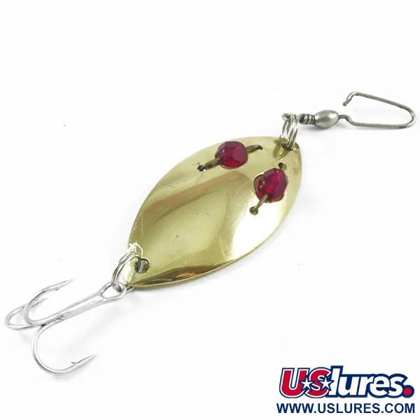 Grote, lichtvangen rode gefacetteerde kralen zijn door het goudkleurige lichaam van deze klassieker uit Rochester geregen, wat een contrastrijk doelwit vormt voor aanbeten. Geïdentificeerd als de Red Eye junior met artikelcode 3216, is deze 5,5 cm lange lepel een veelzijdige 11 g zware uitvoering die zeer langzame presentaties mogelijk maakt, wat vaak nodig is om in de zomer passieve snoek en baars te verleiden. De ingestanste letters op de buik, die verwijzen naar de oorsprong bij Hofschneider Corp. in Rochester, NY, zijn scherp en goed leesbaar. In een 5/5 conditie vertonen de metalen oppervlakken een heldere, gepolijste glans die het licht in de waterkolom effectief reflecteert. Het kunstaas is uitgerust met het originele beslag, voorzien van een zilverkleurige dreg en een wartel met draadclip aan de bovenzijde. Verzamelaars van Amerikaans hengelsportmateriaal zullen de stevige bevestiging van de kenmerkende 'rode ogen' waarderen, die dit model zijn naam en unieke visuele profiel geven.