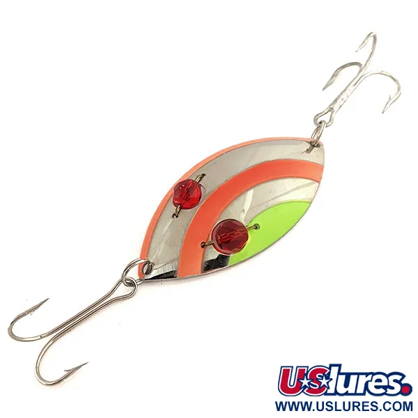 De vernikkelde laag dient als basis voor een levendige set oranje en limoengroene strepen op deze 1oz (25g) Eppinger lepel. Met een lengte van 3" (7,5 cm) is deze Red Eye Wiggler direct herkenbaar aan de twee facetgeslepen rode glazen kralen waaraan het model zijn naam ontleent. Deze ogen zijn via een doorgaande draad met het metalen lichaam verbonden, waardoor ze licht vangen en reflecteren tijdens het langzame binnenvissen dat vaak wordt gebruikt voor snoek of baars in warmer water. Gestempeld op de achterzijde met het Eppinger-merk, draagt het kunstaas productcode 11755 en heeft het een klassiek lepelprofiel dat is gebouwd voor verre worpen. De configuratie is voorzien van een dreg aan zowel de voor- als achterzijde van het lichaam. Dit exemplaar verkeert in 5/5 conditie, met een schitterende afwerking en perfect intacte kleuraccenten op het nikkelen oppervlak.