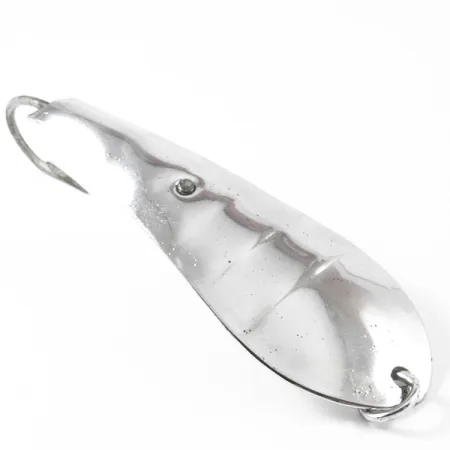 Een gepolijste nikkelen plating bedekt de 9,5 cm (3 3/4") body van deze in Amerika gemaakte lepel, wat zorgt voor een hoogglanzend oppervlak voor diverse lichtomstandigheden. Een zware enkele haak is aan de holle kant bevestigd met een schroef-en-sluitringmontage, het belangrijkste kenmerk van het Luhr Jensen 3312 weedless ontwerp. De stempeling aan de binnenzijde is nog steeds scherp en toont duidelijk het merkteken van de fabrikant en de modelnaam Reflecto. Met een conditiescore van 4/5 behoudt het oppervlak zijn originele glans, met minimale ouderdomssporen die de werking niet beïnvloeden. Dit exemplaar van 21 g (3/4 oz) heeft een opvallend gestempeld oog op het bovenste derde deel van het blad, bedoeld als focuspunt voor roofvissen. De draadbeschermer die de haakpunt afschermt is nog stevig, klaar voor binnenvissen door dichte vegetatie of takken.
