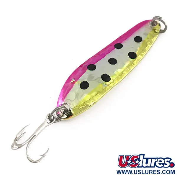 Met een gewicht van 9g (1/3oz) is deze lepel voorzien van een klassieke gehamerde afwerking die ontworpen is om licht in meerdere richtingen te verspreiden. Het Silver / Rainbow Trout patroon is bijzonder goed uitgevoerd op dit exemplaar, met een levendige roze bovenrand en een gele onderrand die een zilveren midden flankeren. Vijf opvallende zwarte stippen zijn langs de middellijn van het 5,5cm (2 1/4") lange lichaam geplaatst om het uiterlijk van een zwemmende forel na te bootsen. Wanneer je het kunstaas omdraait, zie je de merknaam Renegade rechtstreeks in de gepolijste zilveren metalen achterkant gestempeld, samen met de herkomst USA. Geïdentificeerd door productcode 7899, bestaat de hardware uit een scherpe dreg die aan beide uiteinden is bevestigd met splitringen voor een betrouwbare verbinding. De conditie is 5/5, aangezien het kunstaas zijn originele fabrieksglans op alle oppervlakken heeft behouden. Dit model is gebouwd voor veelzijdig gebruik bij zowel werpend vissen als trollen.