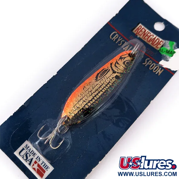 De wafelstructuur op het gehamerde goud met oranje lichaam van deze Renegade Crystalina Spoon zorgt voor een veelzijdige lichtreflectie. Geproduceerd in de VS door Renosky Lure, Inc., meet dit exemplaar (Productcode 10059) 5,5 cm (2 1/4") en weegt 11 g (2/5 oz). De afwerking loopt over van een feloranje rug naar een goudkleurige buik met schubbenpatroon, een kleurcombinatie bedoeld voor forel en diverse roofvissen. Dit item is ongebruikt en zit nog in de originele fabrieksverpakking in de donkerblauwe blister, wat een conditiescore van 6 rechtvaardigt. De lepel is ontworpen voor werpen of trollen en is uitgerust met een zilverkleurige dreg en een bijpassende splitring. De achterkant van de kaart vermeldt dat dit onderdeel is van de Honeycomb Series, ontwikkeld om een reflectie te creëren die lijkt op die van een gewonde aasvis.