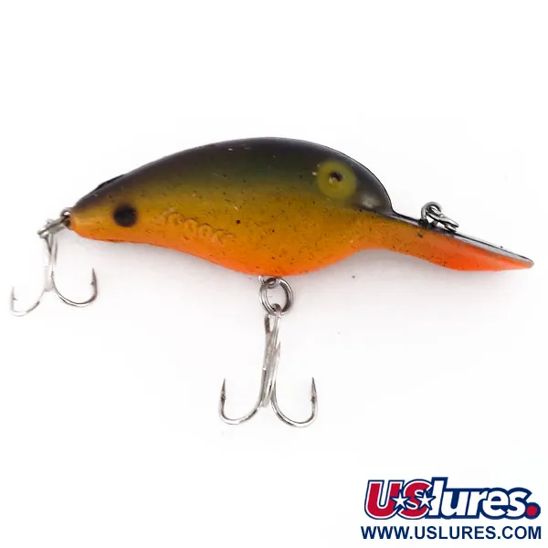 Deze compacte crankbait heeft een lengte van 5,08 cm (2") en is voorzien van een opvallend gradient spuitwerk dat overgaat van een donkerolijfkleurige rug via mosterdgeel naar een levendige oranje buik. Dit exemplaar van 9,4 g (1/3 oz), geïdentificeerd door code 9581, is een klassiek voorbeeld van het in de Verenigde Staten gemaakte materiaal van Rogers, een bedrijf dat al sinds 1959 een vaste waarde is in de hengelsportwereld. De naam "Rogers" is subtiel in reliëf aangebracht op de zijkant van het lichaam, een kenmerk van de vroege productiestijl van de fabrikant die ook te zien is op hun beroemde Big Jim en Hawg Hunter series. De extra grote duiklip is geïntegreerd in het ontwerp van de body om het bereiken van diepere waterlagen te vergemakkelijken terwijl de stabiliteit behouden blijft tijdens het binnenvissen. Beoordeeld met een conditie van 5/5, is het kunstaas uitzonderlijk goed bewaard gebleven, waarbij de originele hardware en zilverkleurige dregjes geen tekenen van ouderdom vertonen. De diepduikende lip blijft helder en stevig, perfect onder een hoek geplaatst voor het vissen rond diepe structuren of taluds.