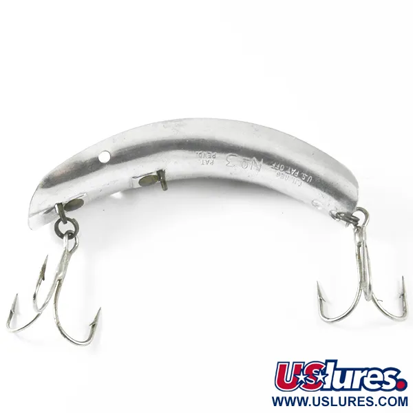 Duidelijk in het verzilverde metaal gestempeld, identificeert de markering "U.S. PAT OFF No 3" dit specifieke exemplaar van 9 g (1/3 oz) als een mid-century klassieker van het in Texas gevestigde Russelure. Met een lengte van 8 cm (3 1/4") weerspiegelt dit model uit 1949 het vroege naoorlogse tijdperk van hengelsportontwerp waarbij duurzaamheid voorop stond. Het halvemaanvormige lichaam is voorzien van twee sterke dreggen die aan de buik zijn gemonteerd met messingkleurige bevestigingen. Gecatalogiseerd onder code 3330, blijft de zilveren afwerking helder en schoon over het gehele gebogen oppervlak. Dit exemplaar lijkt zeer goed verzorgd en behoudt zijn originele integriteit met een conditiescore van 5/5. Het lijnoog en de haakbevestigingen zijn stevig geïntegreerd in het metalen frame, wat de robuuste bouwkwaliteit toont waar Russelure om bekend stond sinds hun oprichting in 1947.