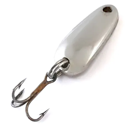 De diep ingestempelde naam 'SALOME' op de binnenzijde van de vernikkeling identificeert dit zeldzame exemplaar uit de Acme-catalogus. Met een gewicht van 1/8oz (4g) en een lengte van 1" (2,5cm) vertegenwoordigt deze kleine lepel een deel van de Amerikaanse hengelsportgeschiedenis dat niet meer wordt geproduceerd. Dit kunstaas is afkomstig uit de VS, heeft een gepolijste nikkelen afwerking en draagt de productcode 5438. De montage bestaat uit een dreg die is bevestigd via een robuuste splitring, die de typische verdonkering van verouderd staal vertoont terwijl de haakpunten scherp blijven. Met een conditiescore van 4/5 blijft de body glanzend en helder, wat de kwaliteit van de vintage productie weerspiegelt. De druppelvorm en het taps toelopende oog aan de bovenzijde kenmerken het klassieke ontwerp van de lepel, waardoor het een opvallende aanvulling is op elke verzameling zeldzame Acme-hengelsportartikelen.
