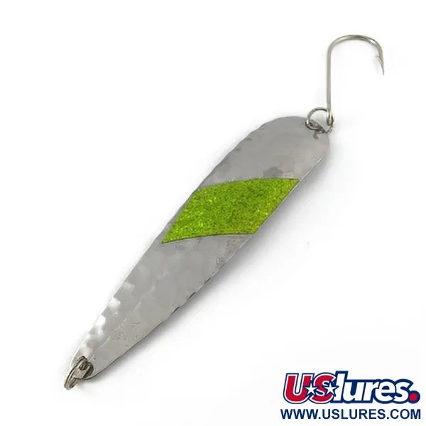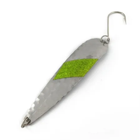 Met een gewicht van 16 g (3/5 oz) biedt de gehamerde metalen body van deze lepel een getextureerd oppervlak dat is ontworpen om licht te vangen via een honingraatachtig patroon. Een schuine, levendige groene glitterstreep is aangebracht in het midden van de zilverkleurige afwerking en dient als visueel focuspunt. Met een lengte van 11,5 cm (4 1/2") is het kunstaas uitgerust met een stevige enkele haak en splitringen aan zowel de kop- als de staartzijde. Geïdentificeerd door product code 23629, dateert dit Sammy PAC (07) model uit 1986 en weerspiegelt het de constructiestijl van dat tijdperk. De staat vertoont de sporen van een lange visgeschiedenis, met slijtage aan het oppervlak en oxidatie die een bescheiden, veelgebruikt karakter geven, gewaardeerd op 1/5.