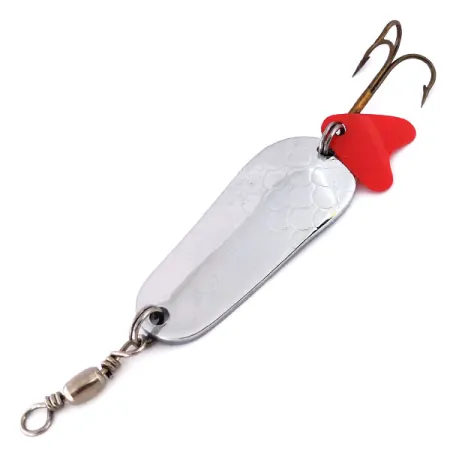 Een klassieke gehamerde nikkelafwerking kenmerkt de voorzijde van deze werplepel uit het midden van de vorige eeuw, ontworpen om licht in gebroken patronen onder het wateroppervlak te reflecteren. Met een gewicht van 16g (3/5oz) en een lengte van 4,7cm (1 3/4"), heeft het kunstaas een kenmerkend druppelprofiel met het iconische "Shakespeare"-logo op de gladde achterzijde gestempeld. Geproduceerd door de William Shakespeare Co. uit Kalamazoo, Michigan (productcode 10213), vertegenwoordigt dit stuk de nalatenschap van het bedrijf dat in 1897 werd opgericht door hengelsportvisionair William Shakespeare. Dit exemplaar verkeert in 5/5 conditie, met een schitterende metaalglans en schoon beslag. Voor extra visueel contrast is een felrode hartvormige plastic flicker bevestigd aan de achterste splitring, samen met een scherpe gebronste dreg. Een zware tonwartel is in de fabriek aan de neus gemonteerd, waardoor de lepel direct klaar is voor bevestiging aan een stalen of monofilament onderlijn.
