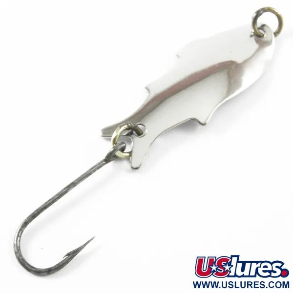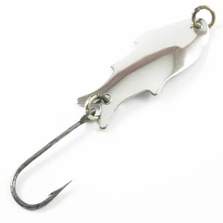 Gepolijste vernikkeling vangt het licht over het 4 cm (1 1/2") lange lichaam van deze klassieke Amerikaanse lepel. Op de achterzijde staat duidelijk de markering "SHOFF'S BIG TRIPLE TEAZER" gestempeld, een signatuur van de Shoff's Tackle Company uit Kent, Washington. Met een gewicht van 2,5 g (3/32 oz) heeft de lepel een opvallend vissilhouet-profiel, compleet met gestileerde vinnen die het metaal zijn karakteristieke vorm geven. Voor de verzamelaar van Pacific Northwest hengelsportmateriaal is dit exemplaar — met productcode 3295 — een fraai voorbeeld van metaalbewerking uit het midden van de eeuw. Hij is uitgerust met een enkele haak die is bevestigd met een messingkleurige splitring aan de staart, met een bijpassende bevestigingsring aan de neus. Een conditiebeoordeling van 4/5 duidt op wat lichte gebruikssporen op de afwerking, terwijl de glans behouden blijft voor display of vissen met licht materiaal. De buiging van het metaal en de gestempelde details zijn goed bewaard gebleven.