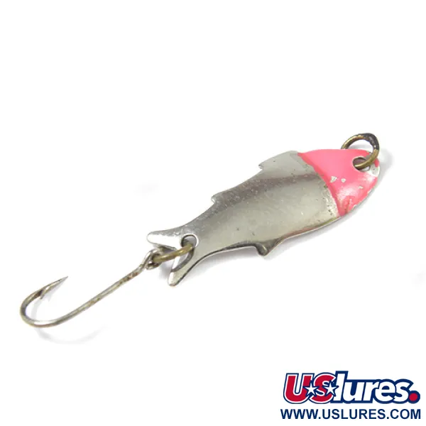 De naam Triple Teazer, rechtstreeks in het metaal aan de onderkant gestempeld, identificeert deze klassieke Amerikaanse lepel van Shoff's. Met een lengte van slechts 3 cm (1 1/4") en een gewicht van een delicate 1,1 g (1/32 oz), is dit kleine kunstaas ontworpen voor lichte tackle en ultra-light visserij. Het vernikkelde lichaam heeft een visprofiel silhouet, compleet met een duidelijke rugvin en een gevorkte staart. Een levendige spat rode verf bedekt het kopgedeelte bij het oog, wat een visuele trigger vormt voor vissen in de buurt. De enkele haak, bevestigd met een splitring aan de achterzijde, blijft schoon en scherp. Geproduceerd in de USA, draagt dit exemplaar de productcode 2171 en vertoont het een lichte geschiedenis van gebruik, wat een solide 4/5 conditiebeoordeling oplevert. De vernikkeling behoudt veel van zijn oorspronkelijke glans, waardoor de gestempelde tekst die Shoff's nalatenschap in de visserijscene van de Pacific Northwest markeert, duidelijk naar voren komt.