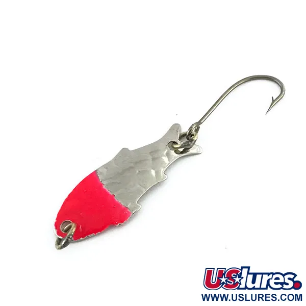 Met een lengte van precies 3 cm (1 1/4") heeft het metalen lichaam van deze Shoff's Triple Teazer een opvallend gehamerd nikkelen oppervlak. Een felroze verflaag op het voorste gedeelte zorgt voor een scherp visueel contrast. Met een gewicht van slechts 1,1 g (1/32 oz) is het profiel van het kunstaas gevormd als een klein aasvisje, compleet met een duidelijk silhouet van een staartvin. De achterkant van het metalen lichaam toont duidelijk de stempel 'SHOFF'S TRIPLE TEAZER', wat de herkomst van de Amerikaanse fabrikant identificeert onder productcode 8973. Dit exemplaar verkeert in ongebruikte staat met een 5/5 score, heeft een helder, schoon oppervlak en een scherpe enkele haak bevestigd met een kleine splitring. De keuze voor een enkele haak duidt op een ontwerp dat bedoeld is voor het werpen met lichte lijnen of trollen op soorten zoals forel en zonnebaars.