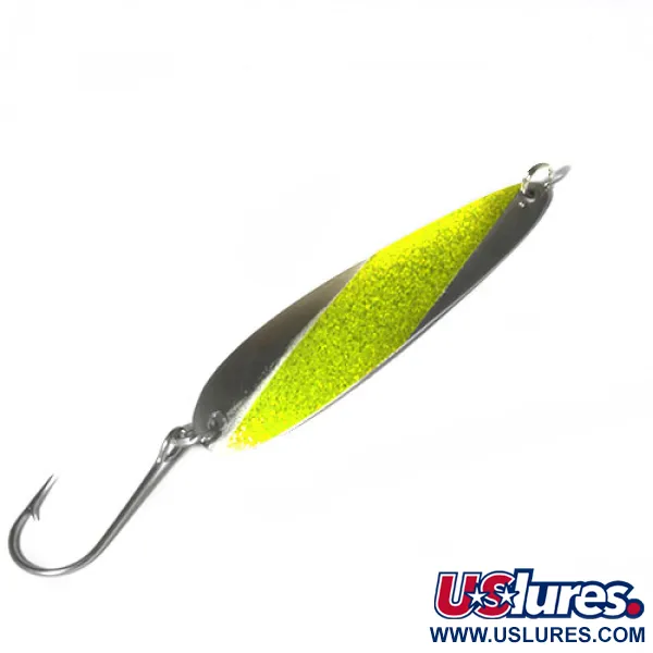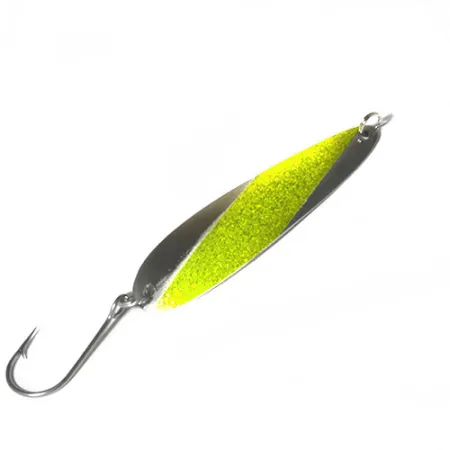 Met een gewicht van 11,5 g (2/5 oz) heeft deze Slammer trollinglepel een kenmerkende diagonale gouden glitterstrip over een gepolijste nikkelen body. Deze in de USA gemaakte specialist voor het slepend vissen van 9,5 cm (3 3/4") is voorzien van de fabrikantnaam gestempeld in de nikkelen achterzijde. Het 0480-model is uitgerust voor het zware werk met een enkele, sterke haak bevestigd via een robuuste splitring, een montage die favoriet is bij vissers op de Grote Meren en kustwateren voor het vangen van soorten met sterke kaken. De afwerking zorgt voor een hoog-contrast schittering, waarbij de reflecterende kwaliteit van nikkel wordt gecombineerd met de getextureerde glinstering van het goud-chartreuse accent. Met een conditie-score van 4/5 behouden de metalen oppervlakken hun originele glans en blijft het beslag strak en functioneel. Specifiek ontworpen voor het gestage tempo van het trollen, is het langgerekte, slanke profiel van de Slammer 0480 gevormd om stabiel te blijven bij verschillende snelheden.