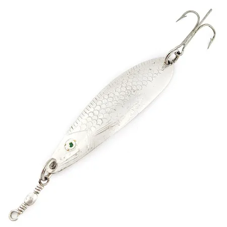 Op de achterzijde van deze 10 g (1/3 oz) lepel staat duidelijk 'MADE IN NORWAY' gestempeld, wat dit een klassiek stuk Scandinavisch vakmanschap van Sølvkroken maakt. Met een lengte van 7,5 cm (3") is dit zilveren exemplaar, herkenbaar aan productcode 23107, voorzien van een gedetailleerd schubbenpatroon dat in het metaal van de voorzijde is geperst. Een opvallende groen geschilderde pupil in het oog vormt een subtiel focuspunt tegen de glanzende metallic afwerking. De achterzijde bevat de modelnaam 'STORLAKSEN', samen met het iconische logo van de springende vis van het merk en een gewichtsmarkering. Voor de montage is het kunstaas uitgerust met een functionele tonwartel aan de kop en een standaard dreg aan de staart. Dit vintage exemplaar heeft zijn oorspronkelijke glans behouden en de staat is beoordeeld als 5/5. Dit specifieke model is ontworpen voor het werpend vissen in zowel zoet- als zoutwater, primair bedoeld voor het gericht vissen op zalm en grote forel.