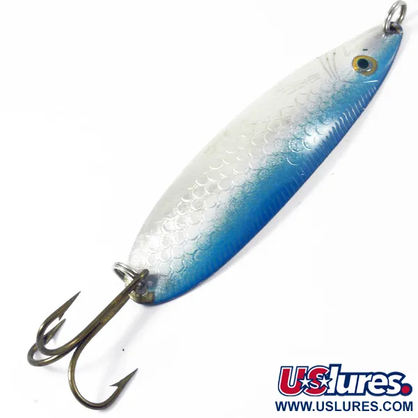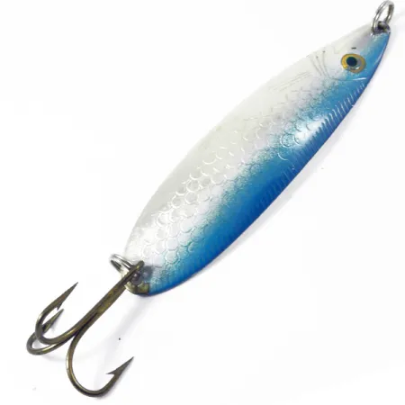 Zilveren schubpatronen met een levendige blauwe flits langs de rand kenmerken de afwerking van deze klassieke Noorse lepel. Met een gewicht van 1/2 oz (15 g) is de Storlaksen een vast onderdeel voor vissers die op zalm en grote forel vissen, voornamelijk gebruikt voor werpen of trollen in stromend water. Het kunstaas is 3 1/2" (9 cm) lang en is voorzien van de authentieke „Sølvkroken Storlaksen“ stempel, diep gedrukt op de gepolijste zilveren achterzijde. Dit specifieke exemplaar draagt de productcode 3354 en vertegenwoordigt de hoogwaardige metaalbewerking die men van het beste hengelsportmerk van Noorwegen mag verwachten. De hardware omvat een stevige dreg met bronzen afwerking, bevestigd via een robuuste splitring, klaar voor zwaar gebruik. De conditie is een solide 5/5, met opvallend schone oppervlakken en scherpe details op de getextureerde voorzijde. Een extra splitring bij de neus biedt een veilig bevestigingspunt voor een directe lijnverbinding of een wartel.