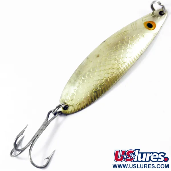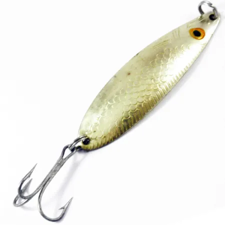 Een gewicht van 10g geeft deze in Noorwegen gemaakte lepel de nodige dichtheid om effectief de diepte te bereiken. De Sølvkroken Storlaksen is 7,5cm lang en heeft een glanzende gouden afwerking die in 5/5 conditie is gebleven. De voorzijde van het kunstaas is voorzien van een realistisch schubbenpatroon in reliëf en een opvallend oranje oog met een zwarte pupil, terwijl de achterzijde een glad, hoogglans gepolijst oppervlak heeft. Dit kunstaas, met productcode 3355, is uitgerust met een sterke dreg en robuuste splitringen. Het langgerekte profiel is een kenmerk van Scandinavisch design, specifiek ontworpen voor het vissen in de sterke stroming van zalmrivieren.