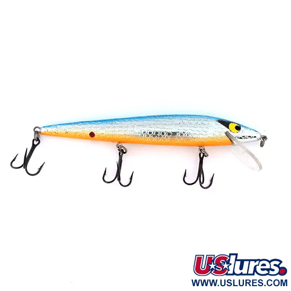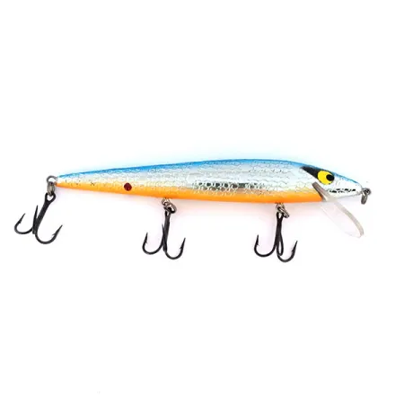 Glinsterende zilveren schubben bedekken de flanken van deze 12 cm lange jerkbait, overgaand in een levendig blauw langs de rug en een feloranje buik. Bekend onder productcode 11035, is deze Smithwick Suspending Rattlin’ Rogue 12 een klassiek voorbeeld van Amerikaans vakmanschap, vervaardigd in de USA. De kop wordt geaccentueerd door een opvallend geel oog in een zwarte traanvormige markering, een kenmerkend visueel detail voor dit model. Een kleine, doelbewuste rode stip bevindt zich net boven het onderste punt bij de staarthaak, wat een subtiel accent geeft aan de metallic afwerking. Als suspending model is dit 12g zware kunstaas ontworpen om roerloos in de waterkolom te blijven hangen wanneer het binnenhalen wordt gepauzeerd. De interne rammelkamer zorgt voor een specifiek geluidsprofiel tijdens gebruik. Afhankelijk van de techniek maakt de transparante plastic lip een duikdiepte van 0,3 m tot 2 m mogelijk bij het werpen, terwijl trollen het kunstaas naar 3 m of 4 m kan brengen. Dit exemplaar verkeert in 5/5 staat, met strak lakwerk en drie scherpe dreggetjes bevestigd aan originele splitringen.
