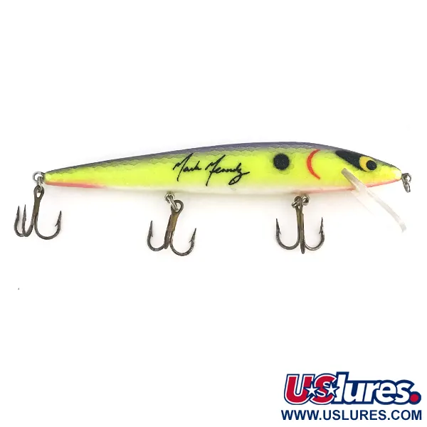 Chartreuse flanken geaccentueerd door een dieppaarse rug bepalen het kleurenpalet van deze 12 cm (4 3/4") lange jerkbait. Deze Smithwick Suspending Rattlin’ Rogue, met productcode 8404, is een Mark Menendez-editie, duidelijk herkenbaar aan de signatuur van de pro-visser op de flank. Met een gewicht van 12 g (2/5 oz) is het kunstaas ontworpen voor specifieke dieptes: 0,3 m tot 2 m (1 ft - 6,5 ft) bij het werpen en 3 m tot 4 m (10 ft - 13 ft) bij het trollen. Een opvallend kenmerk van dit exemplaar is de lichtgevende eigenschap; bij weinig licht geeft het lichaam een sterke groene gloed af, terwijl de karakteristieke zwarte schouderstip en de rode kieuwboog duidelijk zichtbaar blijven. De interne ratelkamer zorgt voor akoestische aanwezigheid tijdens het binnenvissen. Drie scherpe dreggen zijn aan de onderzijde bevestigd en de transparante duiklip is volledig intact. Deze Amerikaanse klassieker verkeert in een conditie van 5/5, met de strakke afwerking en heldere kleuren die men verwacht van een hoogwaardig verzamelstuk.