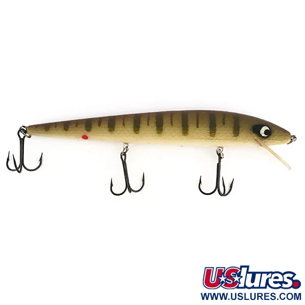 Een klassiek snoekpatroon met donkere verticale strepen over een lichtbruin verloop siert het 14 cm (5 1/2") lange lichaam van dit vintage kunstaas. De Smithwick Suspending Rattlin’ Rogue, geregistreerd onder productcode 8906, heeft een neutraal drijfvermogen (suspending), waardoor hij in de strike zone blijft hangen bij een werpdiepte van 0,3 m tot 2 m. Bij het trollen brengt de heldere duiklip het kunstaas naar een diepte van 3 m tot 4 m. Dit exemplaar is in 5/5 conditie, met een perfecte afwerking, de karakteristieke wit-zwarte ogen en een rode stip bij de staartdreg. De drie dreggen zijn stevig bevestigd aan het 14 g (1/2 oz) frame, dat een intern ratelsysteem bevat dat typisch is voor de vintage productie van Smithwick.