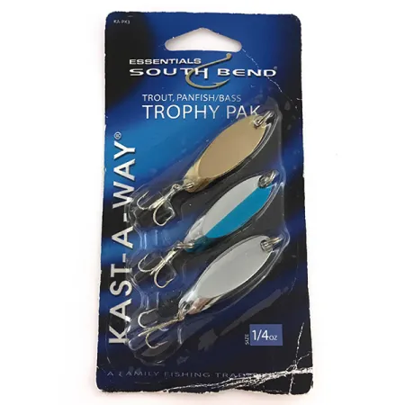 Met een gewicht van 1/4oz (7g) per stuk maken deze lepels deel uit van de South Bend Essentials-lijn, ontworpen voor veelzijdige zoetwatertoepassingen. Dit Trophy Pak, herkenbaar aan productcode 8451, bevat drie kunstaantjes met een lengte van 1 3/4" (4.5 cm). De set bestaat uit een goudkleurige lepel, een gepolijste nikkelen lepel en een derde nikkelen optie met een levendige blauwe streep. Deze lepels zijn geconstrueerd met een druppelvormig metalen profiel en uitgerust met dregjes, bedoeld voor het werpen nabij dekking zoals plantenbedden of gezonken hout. Deze specifieke exemplaren zijn ongebruikt en bewaard gebleven in hun originele vintage verpakking. South Bend ontwikkelde deze "Kast-A-Way"-serie als een betrouwbare basis voor vissers die jagen op forel, baars en black bass. De verpakking bevat handige tips voor het vissen rond onderwaterstructuren waar deze lepels het meest effectief zijn.