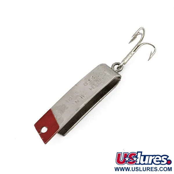 De nikkelen afwerking met een vleugje rode verf op de neus maakt dit klassieke, U-vormig gevouwen metalen kunstaas uit de VS direct herkenbaar. Met een gewicht van 2,3 g (3/32 oz) en een lengte van 3 cm (1 1/4") vertegenwoordigt de South Bend Super-Duper 501 een kenmerkende periode van minimalistisch hengelsportontwerp. Het lichaam is gevormd uit een enkele metalen strip die dubbelgevouwen is, wat zorgt voor een slank profiel dat stabiel blijft tijdens het binnenvissen. De ingeslagen letters op de zijkant geven duidelijk het merk en model aan en vormen een tastbare link naar de herkomst. Een enkele dreg is via een splitring aan de achterste lus bevestigd, wat de originele configuratie toont. Met een score van 5/5 zijn de oppervlakken van dit exemplaar glanzend en blijft het rode accent scherp en goed gedefinieerd zonder noemenswaardige slijtage. Dit specifieke item is geregistreerd onder productcode 15315 en valt op als een ware zeldzaamheid voor verzamelaars van Amerikaans metalen kunstaas uit het midden van de vorige eeuw.