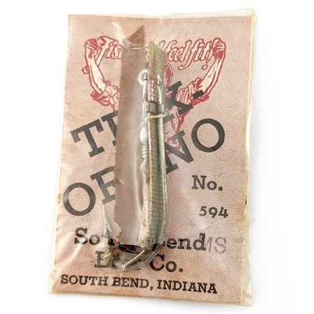 Met een lengte van 4,5 cm (1 3/4 inch) toont de zilver-rode afwerking van dit metalen kunstaas een klassiek mid-century ontwerp. Met een gewicht van 2 gram (1/16 oz) is de South Bend Trix-Oreno 594 speciaal ontworpen voor gebruik met de vliegenhengel, lichter geconstrueerd dan een spinner voor een betere hanteerbaarheid. Dit exemplaar is voorzien van productcode 21699 en is ongebruikt, bewaard in de originele verpakking van papier en plastic van de South Bend Bait Co. uit Indiana. Het kunstaas is ontworpen om tijdens het afzinken te dwarrelen als een levend insect, wat helpt om forel en andere vissoorten in diepe kolken te bereiken in het vroege seizoen of op warme dagen. Bij het binnenvissen zorgt de constructie ervoor dat het kunstaas door het water duikt en schiet als een aasvisje. De originele instructies specificeren dat dit model is uitgerust met een haak maat 1 en uitstekend presteert in combinatie met een strip varkenshuid.