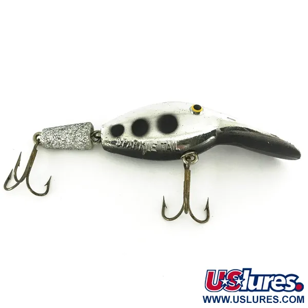 De verzilvering geeft deze 8 cm lange gelede plug een klassieke reflectie die het licht vanuit elke hoek vangt. Deze Eppinger Sparkle Tail, geregistreerd onder productcode 7223, heeft een kenmerkend met glitter gecoat achterdeel dat hem onderscheidt van de standaard hardbaits uit zijn tijd. Het lichaam wordt geaccentueerd door drie opvallende zwarte stippen langs de zijkant, geplaatst net boven de gestempelde modelnaam "SPARKLE TAIL". Met een gewicht van 10 g bestaat de constructie uit twee segmenten die zijn verbonden door een stevig metalen scharnier, gecombineerd met een duiklip die is ontworpen voor een drijvende-naar-duikende presentatie. De zilveren afwerking is opmerkelijk goed bewaard gebleven, wat een uitstekende conditiescore van 5/5 oplevert, hoewel de originele buik- en staartdreggen de karakteristieke verdonkering van vintage staal vertonen. De gele ogen met kleine zwarte pupillen zitten prominent aan de voorkant en bieden een gericht mikpunt op het metalen profiel. Dit in Amerika gemaakte kunstaas maakt gebruik van een drijfvermogen-gestuurd ontwerp, bedoeld voor werp- of trolltechnieken.