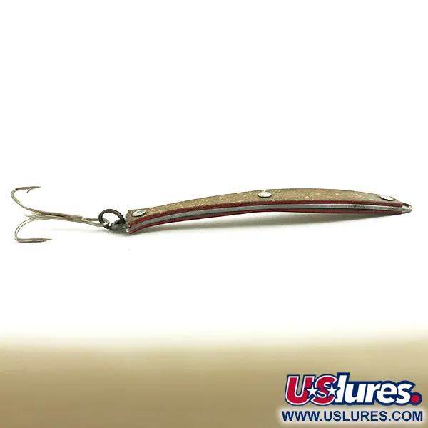 Met een gewicht van precies 1/2oz (14g) wordt het profiel van deze vintage lepel gekenmerkt door een gelaagde opbouw en een sprankelende gouden glitterafwerking. De Sparky Jr. Spoon Sparkling Minnow, met productcode 5751, is een Amerikaans ontwerp uit het midden van de vorige eeuw (1951). Langs de randen zorgt een dieprode tint voor een tweekleurig effect tegen het getextureerde gouden lichaam, dat is verankerd met drie opvallende zilverkleurige klinknagels. Het authentieke "SPARKY JR" stempel is in het materiaal geperst en blijft duidelijk leesbaar door de afwerking. Met een lengte van 3 1/2" (9cm) verkeert dit exemplaar in 5/5 staat, met een goed bewaard gebleven buitenkant en glanzend beslag. Een klassieke dreg is aan de staart bevestigd, geschikt voor werpen of trollen.
