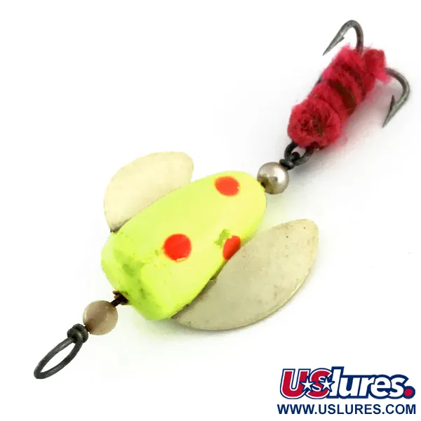 Dankzij de fluorescerende eigenschappen licht het neongele lichaam van deze Shur Strike Spin-n-Glo UV op onder ultraviolette straling, geaccentueerd door een patroon van helderrode stippen. Dit specifieke model, productcode 9479, toont de toewijding van de fabrikant aan een presentatie met hoge zichtbaarheid. De montage is voorzien van twee bleke draaiende vleugels gemonteerd op een cilindrisch lichaam van 7 cm, ondersteund door een centraal draadframe. Aan de basis scheiden metalen kralen het lichaam van een dreg die is afgewerkt met zachte rode vezels. Met een gewicht van exact 3,6 g verkeert het kunstaas in uitstekende 5/5 staat zonder zichtbare beschadigingen of slijtage. Dit vintage exemplaar uit de VS benadrukt de klassieke combinatie van harde onderdelen en gedresseerd eindmateriaal voor zichtbaarheid in diep water.