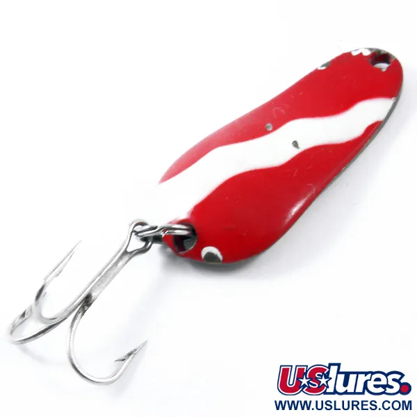 De onderkant van deze messingkleurige en duidelijk gestempelde lepel is voorzien van de aanduiding Spinno-King No 00. Het metalen lichaam meet 3,5 cm (1 1/2"), weegt 7 g (1/4 oz) en heeft een contrastrijk rood-wit golfpatroon op de voorkant. Dit exemplaar, met productcode 3374, wordt toegeschreven aan Weller en deelt zijn erfgoed met de Pecos River Tackle Co. uit New Mexico, VS. Het beslag bestaat uit een enkele dreg aan de basis. Kleine chipjes in de geëmailleerde afwerking getuigen van de tijd die in een tacklebox is doorgebracht, wat resulteert in een conditiescore van 4/5. Het druppelvormige profiel en de degelijke bouw zijn kenmerkend voor Amerikaanse metalen kunstaas uit het midden van de vorige eeuw.
